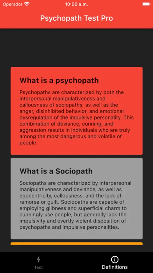 Our psychopathy test mobile app is designed to help individuals identify if they have any tendencies towards psychopathy. The app uses a scientifically validated assessment tool that measures various traits and behaviors associated with psychopathy, such as callousness, manipulativeness, and irresponsibility.