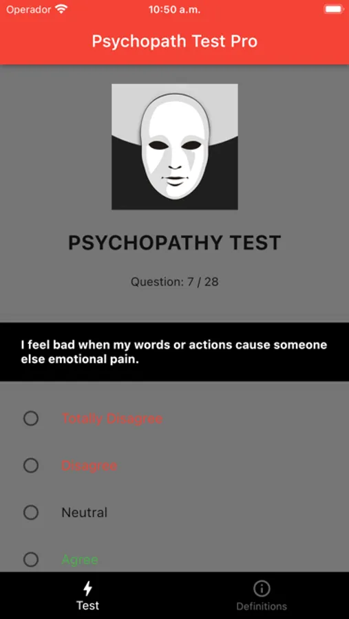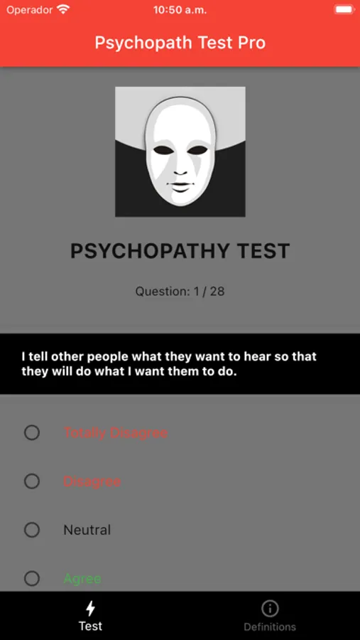 The test comprises a series of questions that are easy to understand and answer. Users are asked to rate themselves on a scale from strongly disagree to strongly agree for each question. Once the test is completed, the app generates a comprehensive report that provides a score on the psychopathy scale.