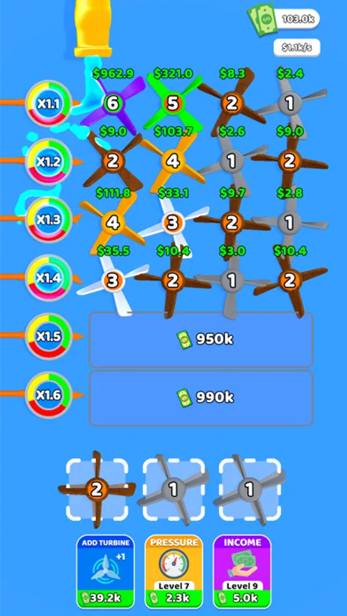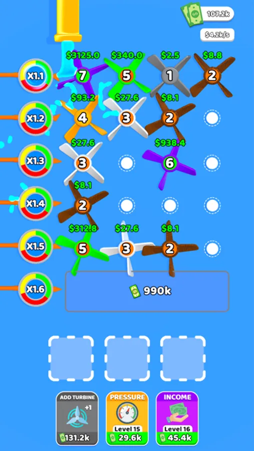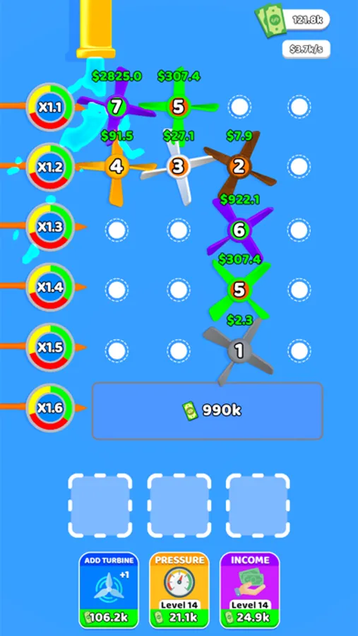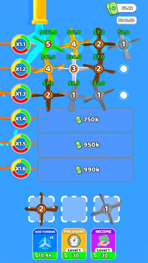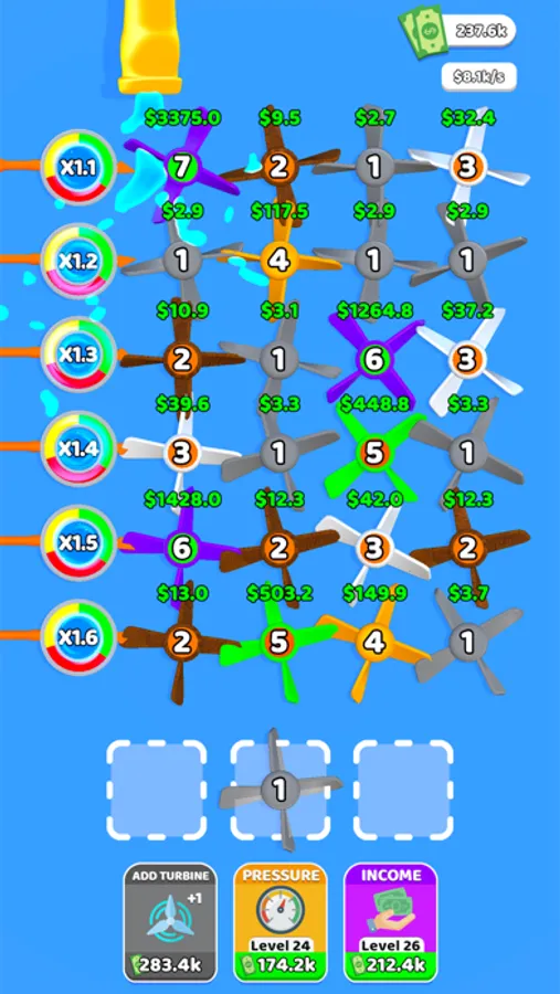 It's time to use the flow of water to spin your rotators. Earn money as you spin and tap to make more. Use your money to upgrade your stats and expand the area. Start spinning now!