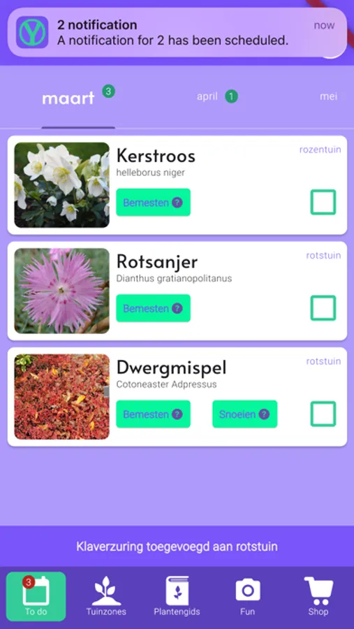 Maak nu jouw persoonlijke tuinkalender aan en ontdek het gemak zelf. Begin met het toevoegen van jouw tuinborders (tuinzones genoemd in de app). Voeg vervolgens per zone de tuinplanten die in jouw tuin staan toe. De app laat je vervolgens per maand zien wat er te doen is in jouw tuin. Bovendien vergeet je zo nooit meer waar wat staat.