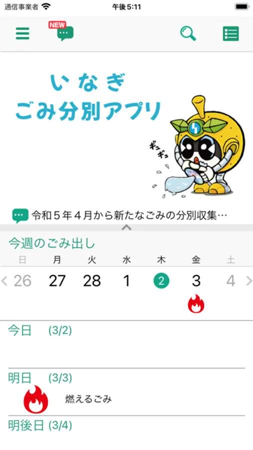 収集日変更のお知らせやイベント情報などを確認することができます。