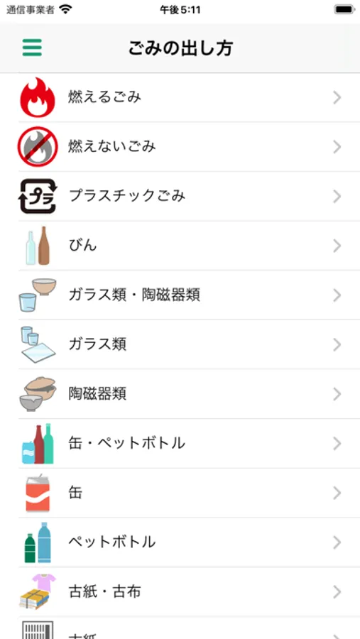 ごみの種別ごとに、主な品目と出し方を確認することができます。