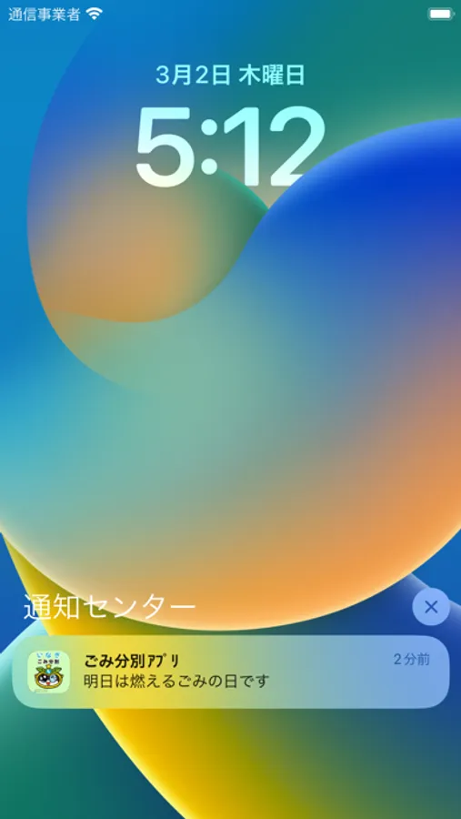 収集予定のごみ種別を前日と当日にアラートでお知らせします。時間は自由に設定することができます。