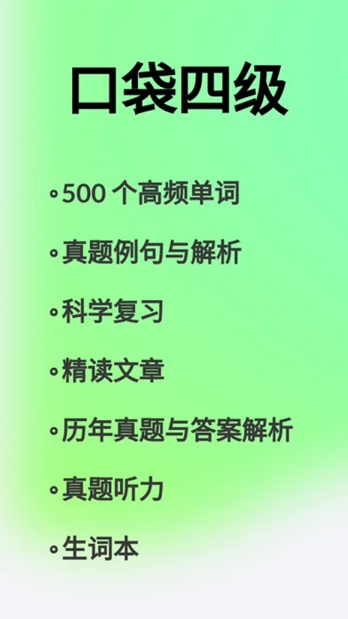 口袋四级根据《全国大学英语四级考试大纲》的词表并基于 2014 ~ 2023 年的 63 套四级考试真题甄选出 500 个四级高频单词。