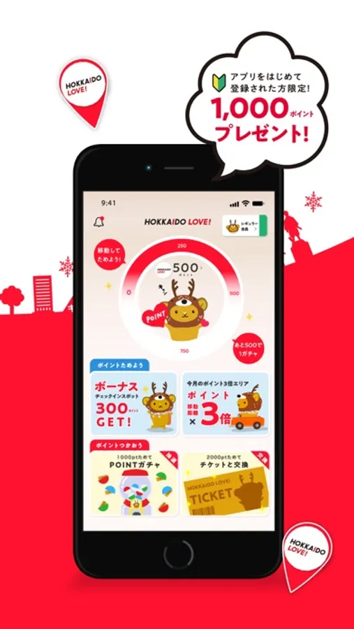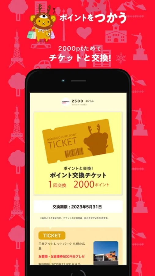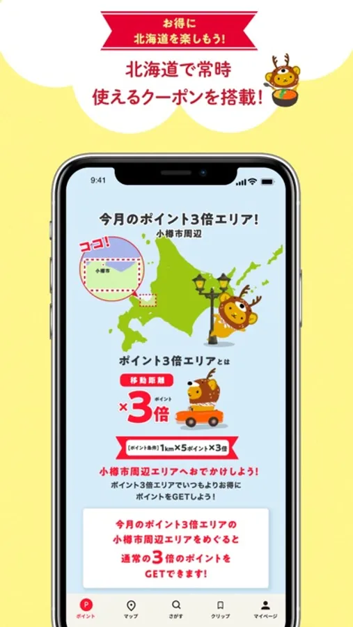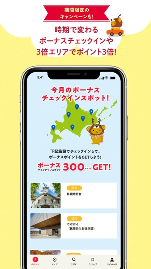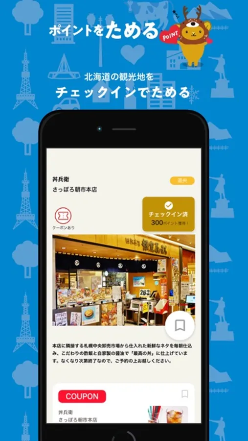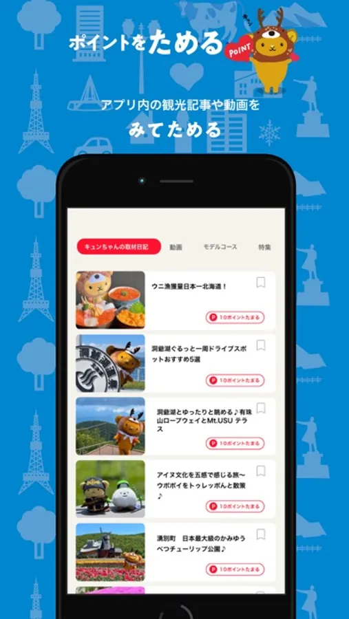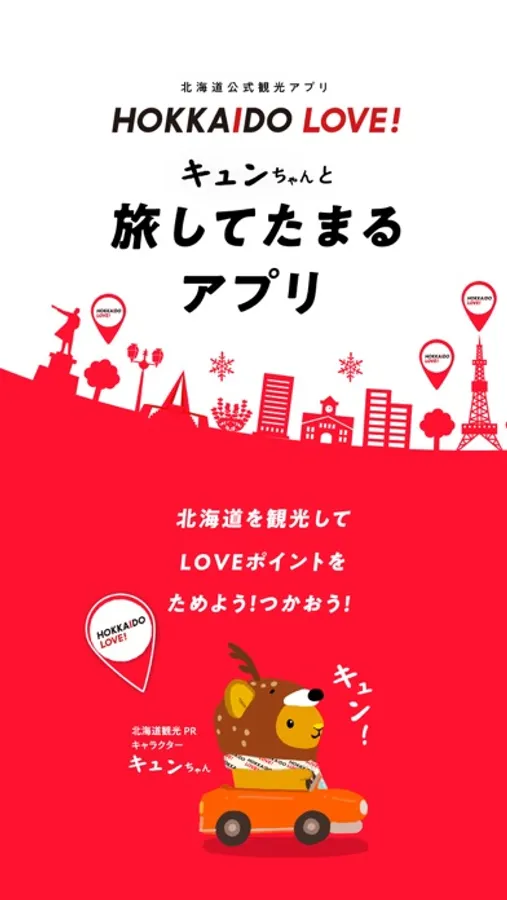 LOVEポイントをためてつかって北海道の観光を楽しめるアプリです。キュンちゃんと一緒に旅を楽しもう!