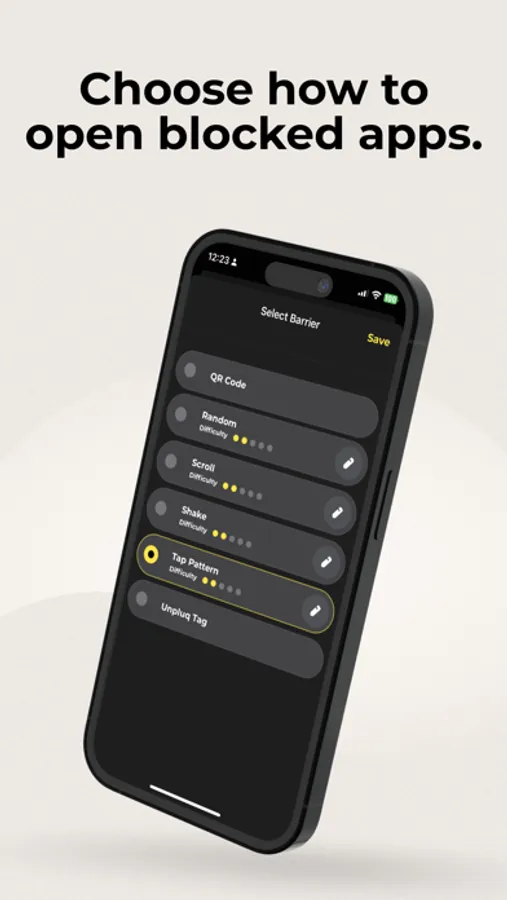 - All Barriers: Use all the available barrier options, including the patented Unpluq Tag, the keyfob that keeps you focused, as well as Scrolling, Random, or QR code barriers.