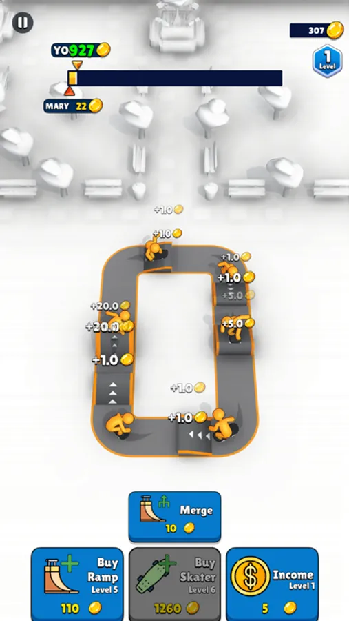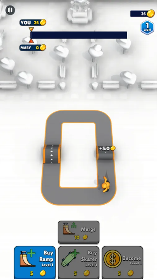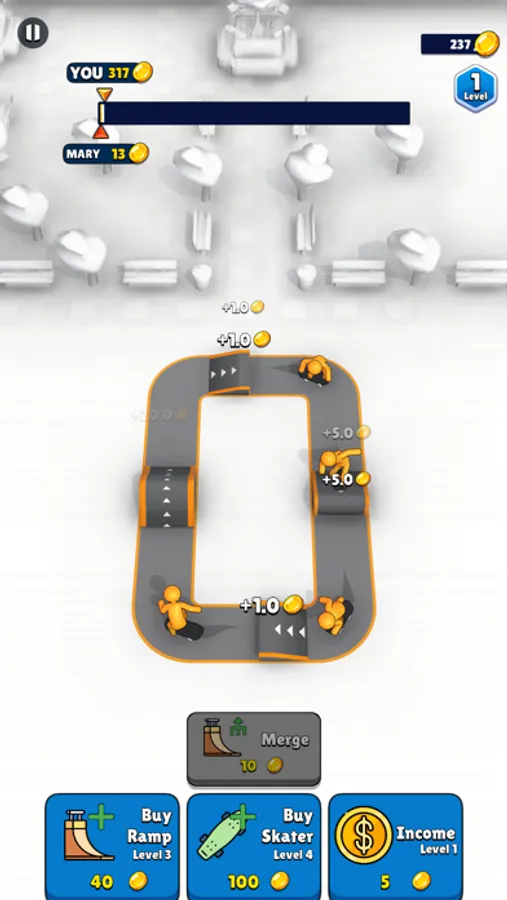 Buy skateboarders, place ramps, start earning money, merge ramps, earn more money and complete the track before your opponent!