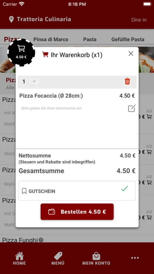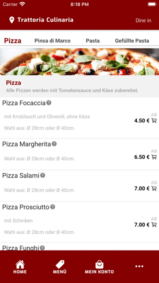 Herzlich Willkomen bei Trattoria Culinaria in Frankfurt am Main. Wir bedienen unsere Kunden mit Pizza, Pasta, Salate, Fleischgerichte Speisen und machen das seit mehreren Jahren aus Leidenschaft. Wir freuen uns immer wieder neue Kunden unsere Herkunft näher zubringen und möchten ihnen die Möglichkeit geben, ihre Bestellung unkompliziert und total einfach abzugeben. Aus diesem Grund, möchte wir ihnen unsere neue App und unseren Online Shop vorstellen, mit dem Sie problemlos über Paypal, Bar und Kreditkarte zahlen können.
