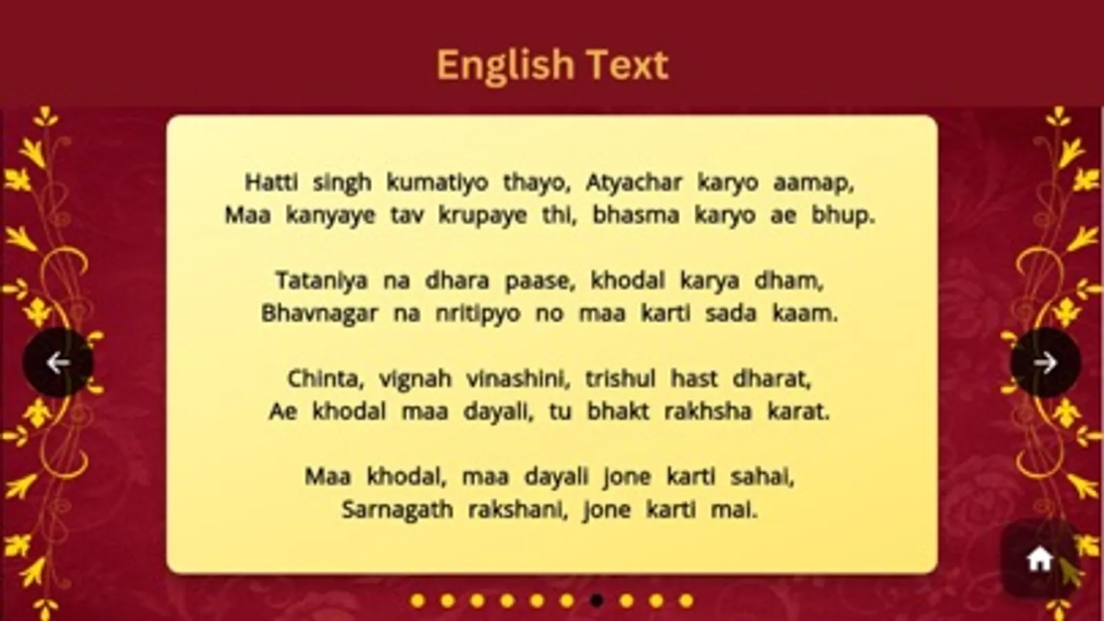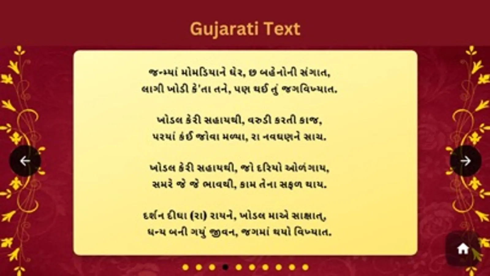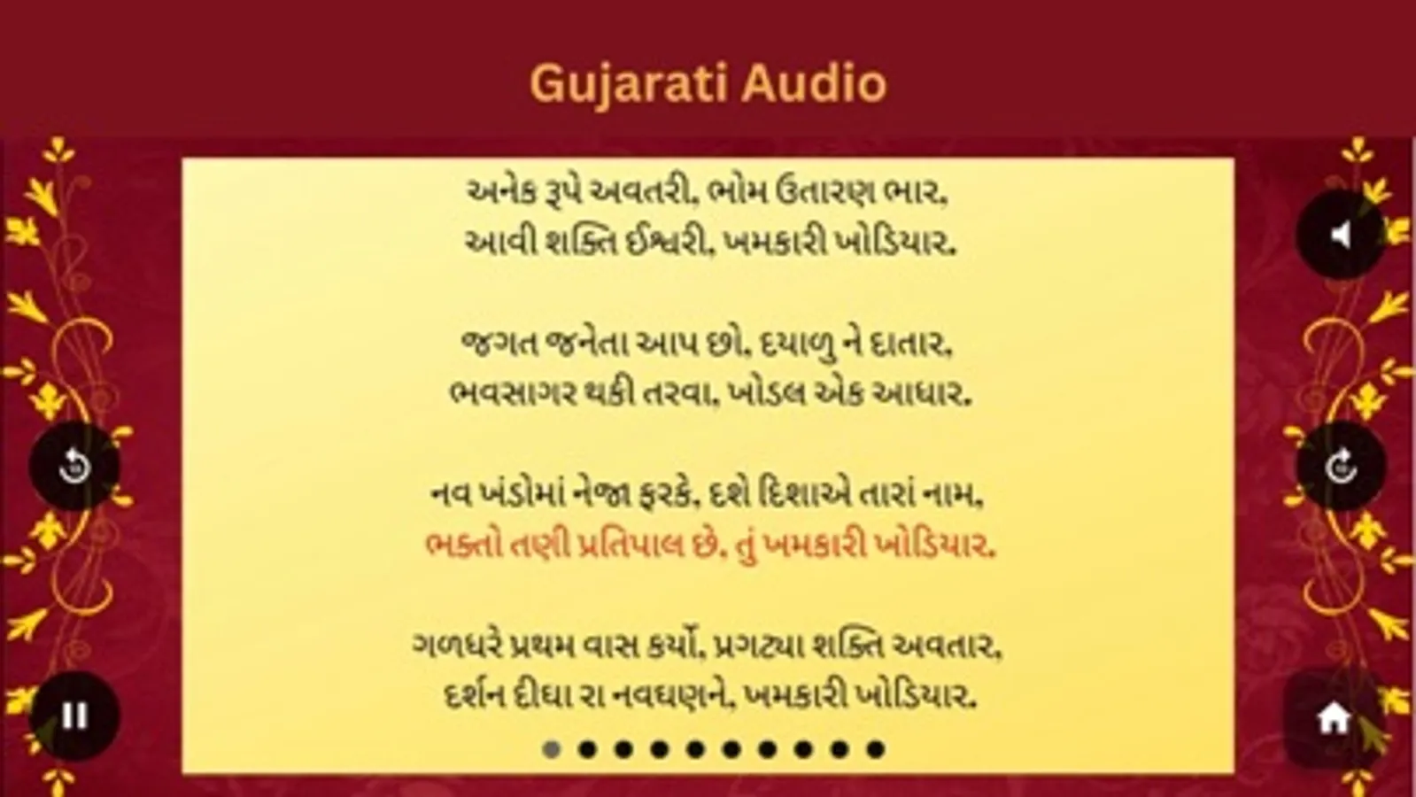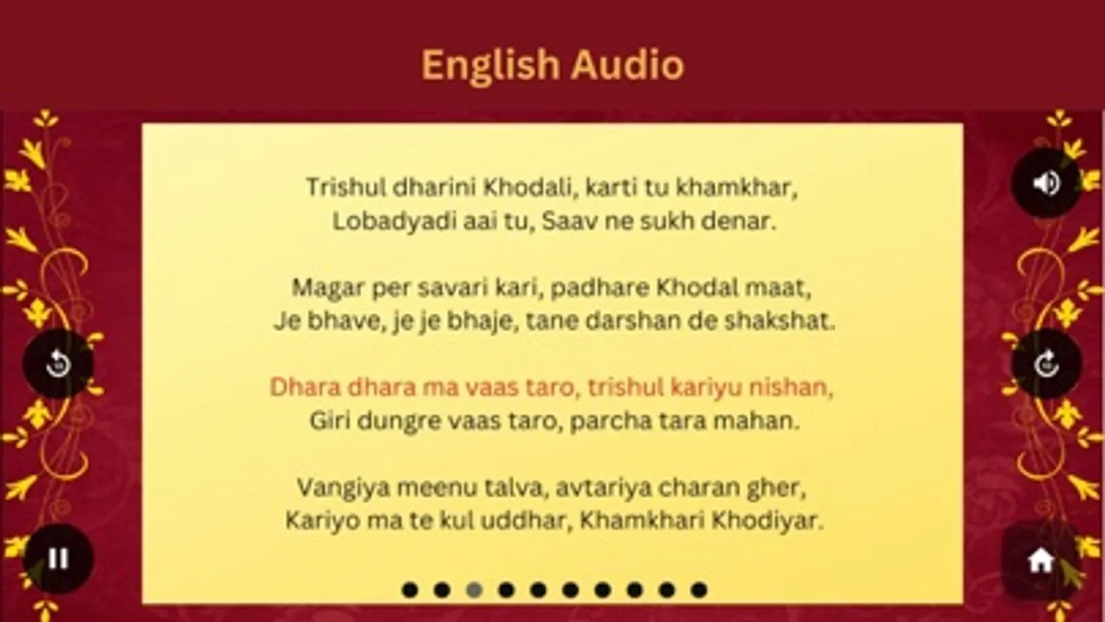 In conclusion, the Khodiyar Chalisa app is a comprehensive and user-friendly resource for devotees of the goddess. It provides easy access to the chalisa in both English and Gujarati languages, with features that enhance the user's ability to recite and listen to the chalisa with ease. The app also includes several convenient options like text and audio, slider option, mute option, play, pause, forward and reverse options, making it easy for the users to navigate through the different verses of the chalisa and control the playback of the audio. The goal of the app is to spread the divinity of Maa Khodiyar amongst her numerous devotees and increase her glory.