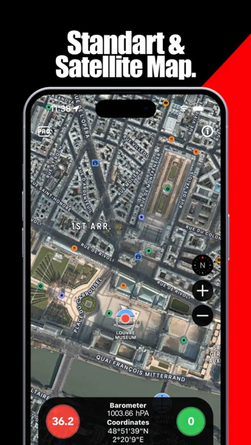 6. Map: The app incorporates maps, including Standard, Hybrid, and Satellite views. You can track your position on the map, which can be helpful for navigation and orienteering.