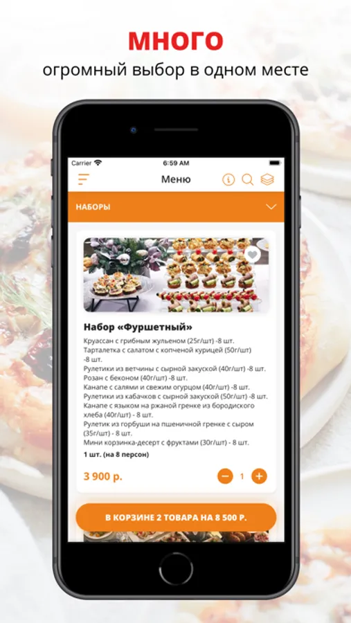 Большой ассортимент готовых фуршетных блюд на любой вкус: от классических профитролей до тарталеток и мини-шашлычков . А готовые банкетные наборы позволяет оформить заказ в 2 минуты.