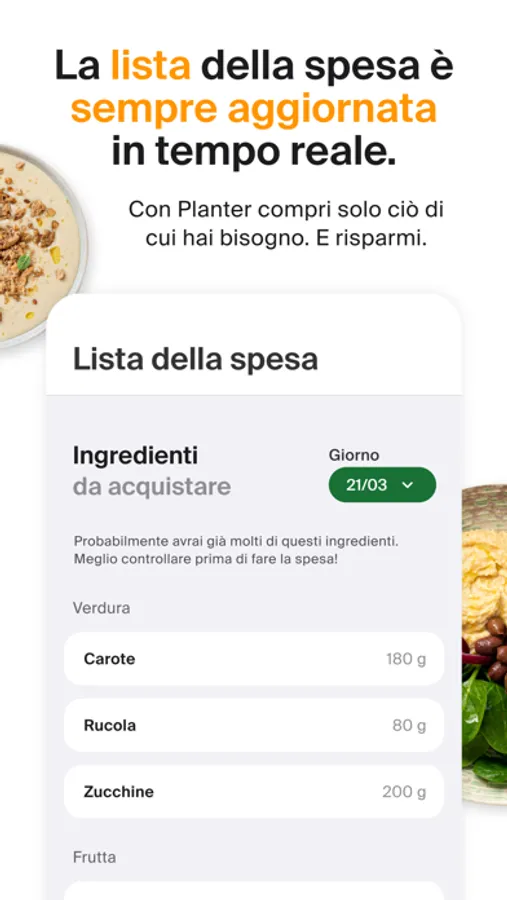 - La lista della spesa sempre aggiornata in tempo reale, in base al tuo piano e alle modifiche che avrai apportato. Così compri solo ciò di cui hai bisogno, e risparmi.