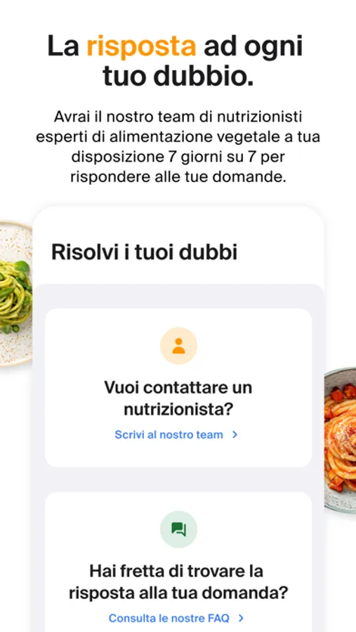 - Il nostro team di nutrizionisti esperti di alimentazione vegetale a tua disposizione 7 giorni su 7 per rispondere in chat alle tue domande.