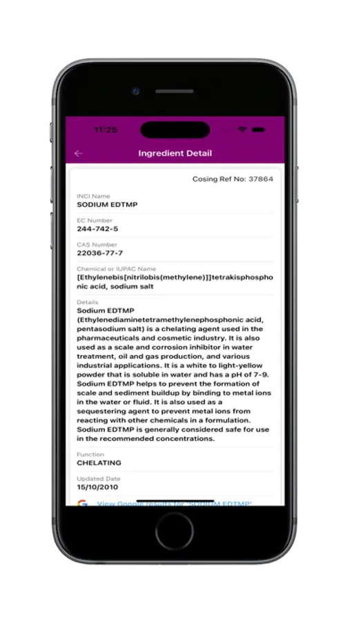 Once the ingredient is found and chosen, this then provides complete set of details about the ingredient including INCI Name,