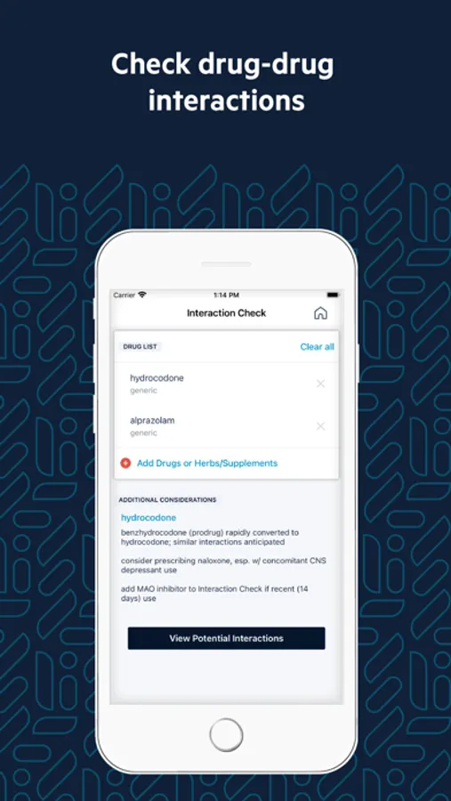 • Drug interaction checker: prevent harmful interactions between up to 30 brand, generic, OTC, or alternative drugs at a time