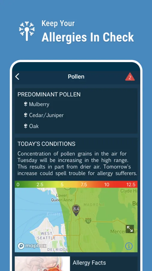 • Pollen Count: Keep your allergies in check by knowing what the local pollen conditions are like