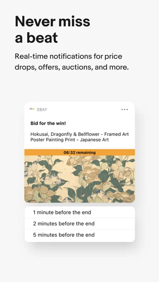 With the eBay app, stay in the know with real-time alerts about the latest deals, your order updates, & much more — sent to your device with personalized notifications.