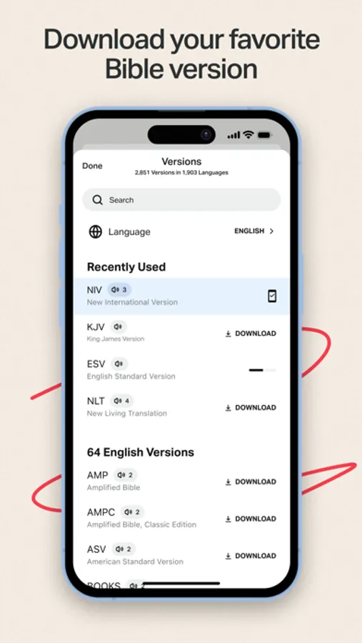 Customize your Bible App experience. Access everything when connected, or download specific versions to use offline.