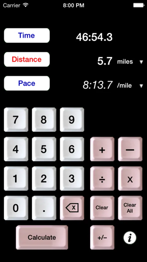 • Calculate time, distance, or pace (speed) by entering any two and calculating the third.