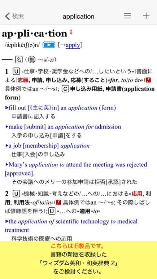 【重要なお知らせ】2012年12月29日に、書籍の新版「ウィズダム英和辞典(第3版)」と「ウィズダム和英辞典(第2版)」を収録した新アプリ「ウィズダム英和・和英辞典 2」をリリースいたしました。こちらは本アプリ「ウィズダム英和・和英辞典」とは別のアプリとなりますので、ご購入を検討されているお客様はご注意ください。