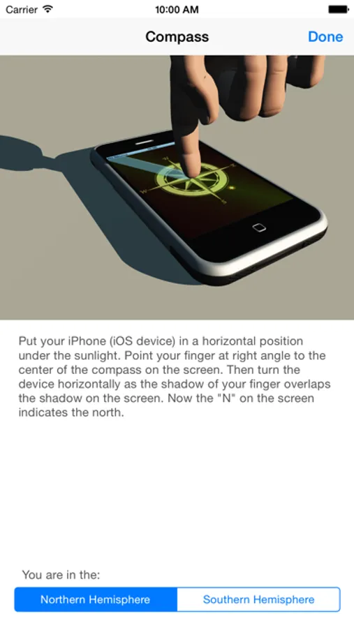 Compass is a measuring instrument which indicates the cardinal points under the sunlight. Put your finger in the middle of the compass and line it's shadow up with the app's shading.
