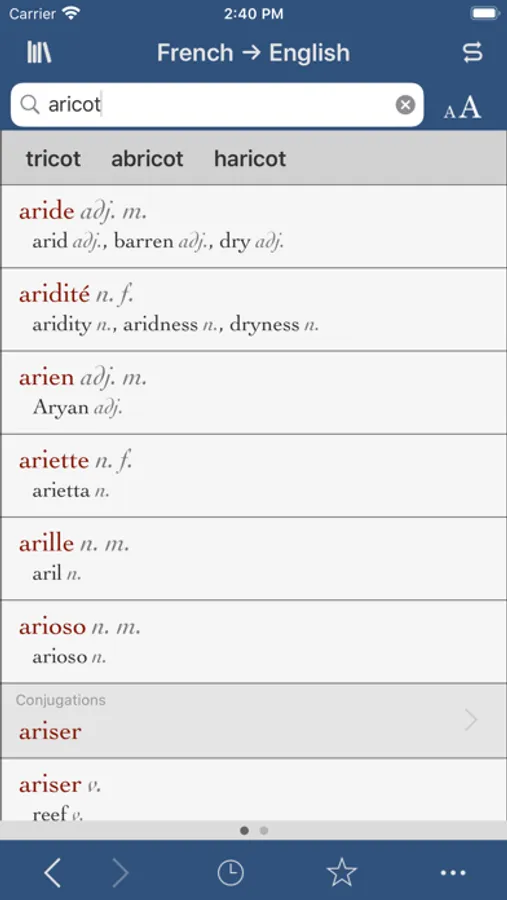 • Tap the history button to view the 50 most recent dictionary definitions, verb conjugations, and more in one place. Sort the list alphabetically or by date, and choose to clear the list completely or delete one entry at a time.