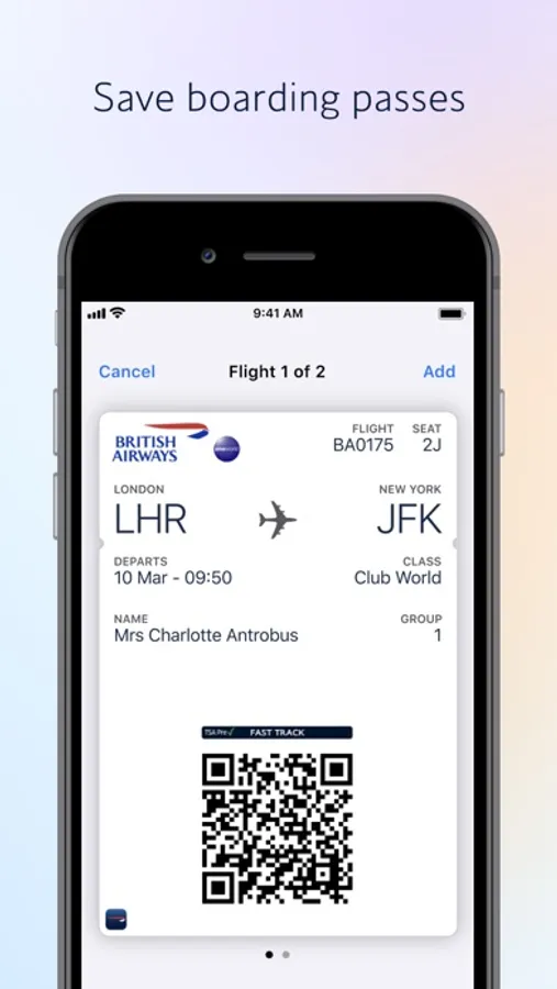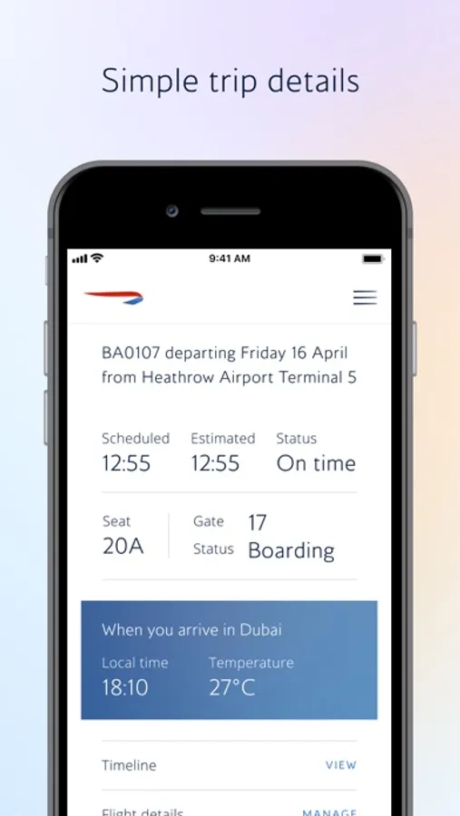 Your home screen is your personal gateway into the BA app. Themed around your next destination, it will give you easy access to important information surrounding your flight, including your mobile boarding pass.