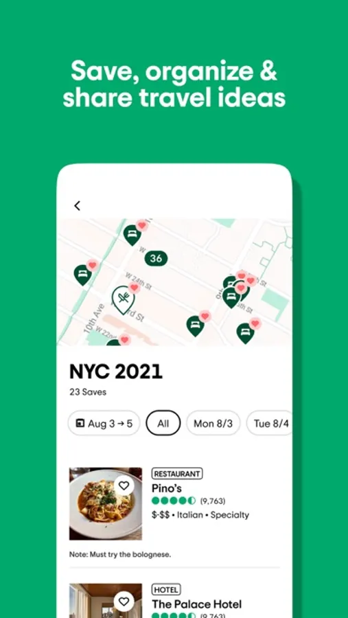 • Use our planning tool, Trips, to save and organize traveler-recommended places. See your saves on a map, as well as share and collaborate with your travel companions.