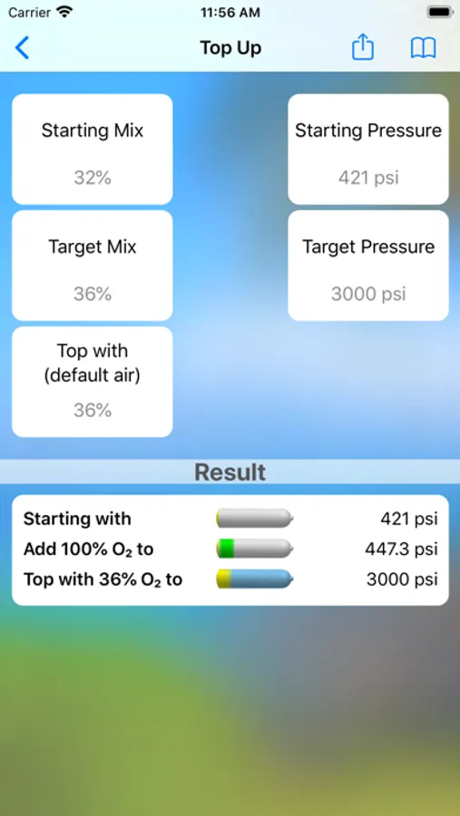 • Bleed Down - save expensive oxygen and valuable time by easily calculating how much gas to bleed from an existing cylinder to switch to a different mix using air or any available topping mix.