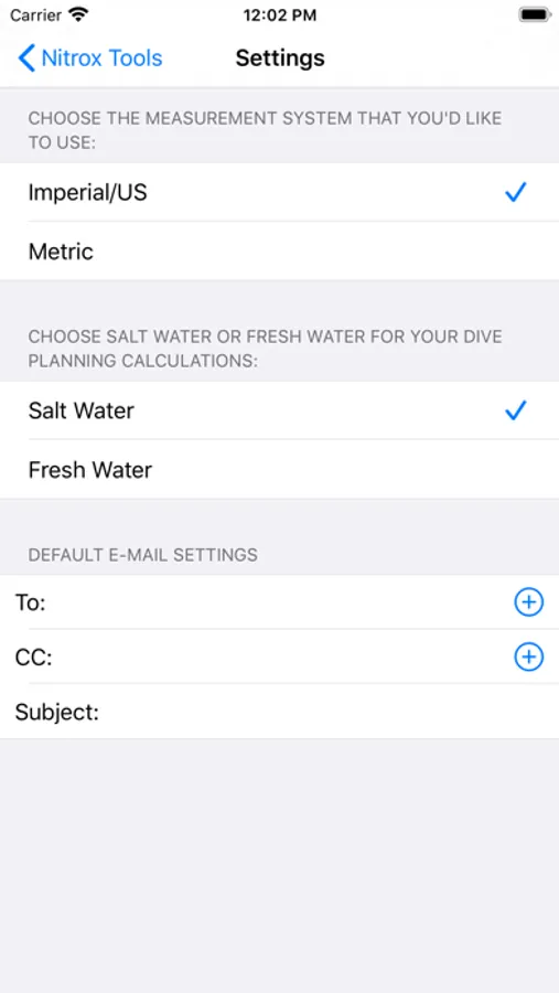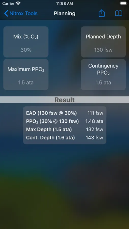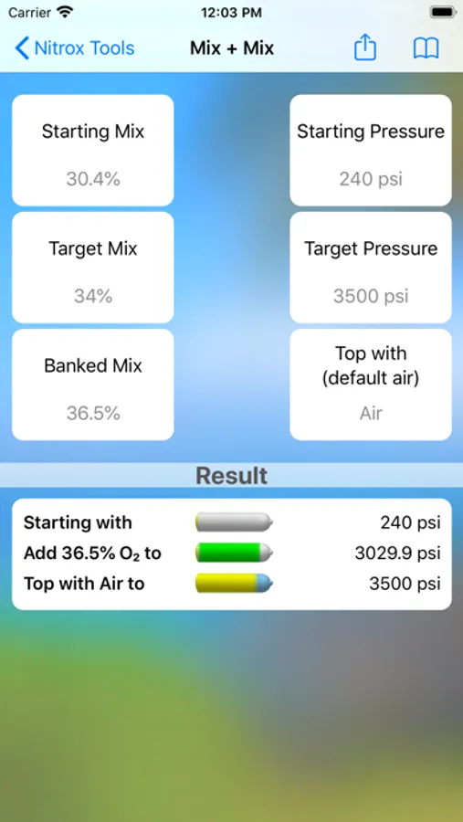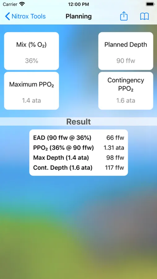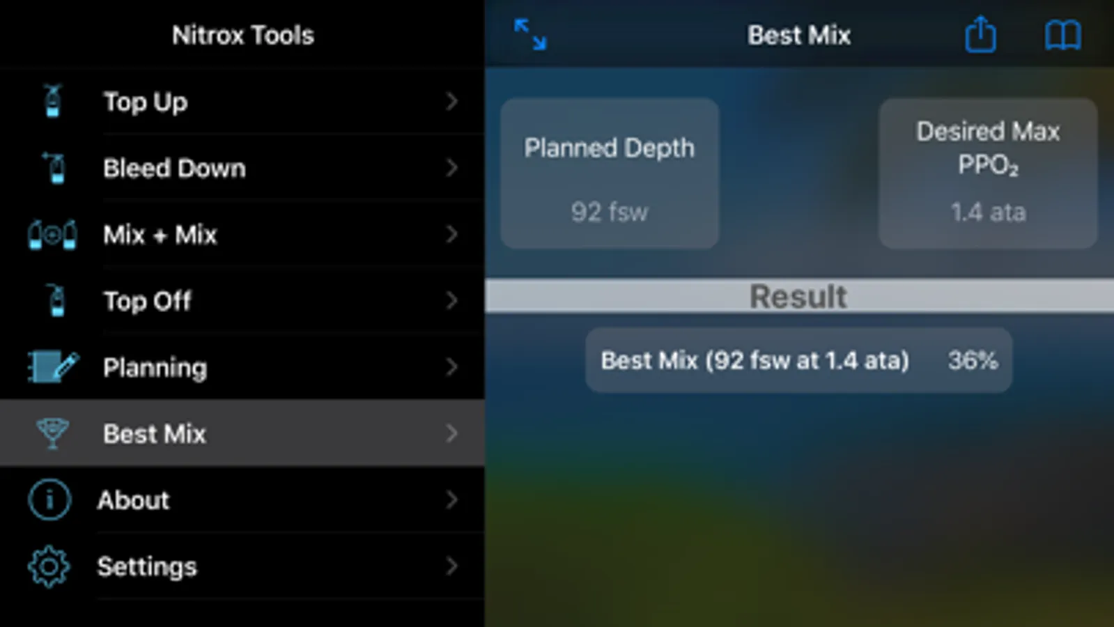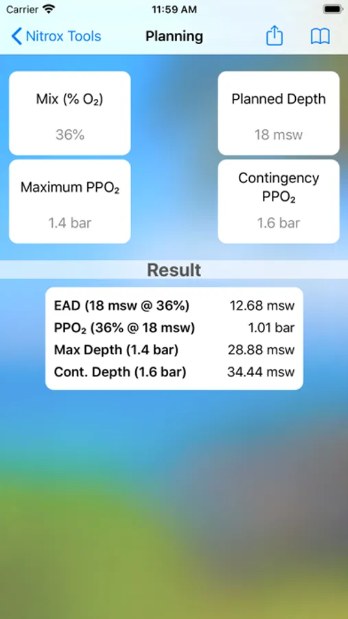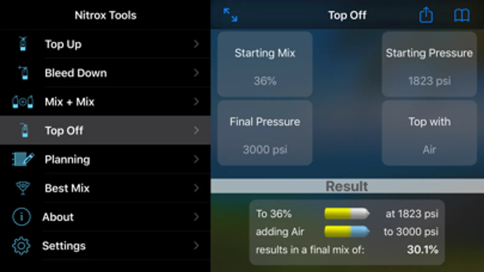 Do you need to share your planning or blending calculations with other divers? All the tools have the ability to share the results of the calculations from within the application. You can set default email addresses and a subject within Nitrox Tool's settings that will be automatically added when you share a result.