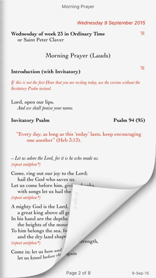 The complete official Liturgy of the Hours of the Catholic Church, as used worldwide. Morning (Lauds), daytime (Terce, Sext and None), evening (Vespers), night (Compline) and the deeply reflective Office of Readings. Do as many or as few of them as you like.