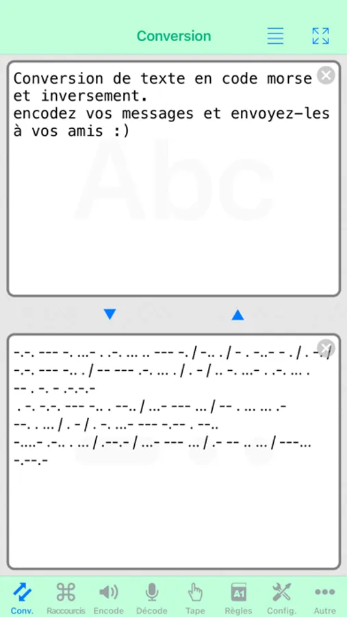 A special screen allows textual conversion of Morse code and text. Exchange encrypted messages with your friends.