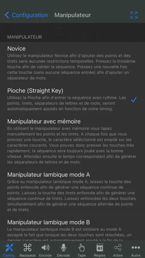 Several input types are supported: Novice, Straight Key, Memory Paddle, Iambic Paddle (A and B), Microphone. Left and right handed modes are supported.