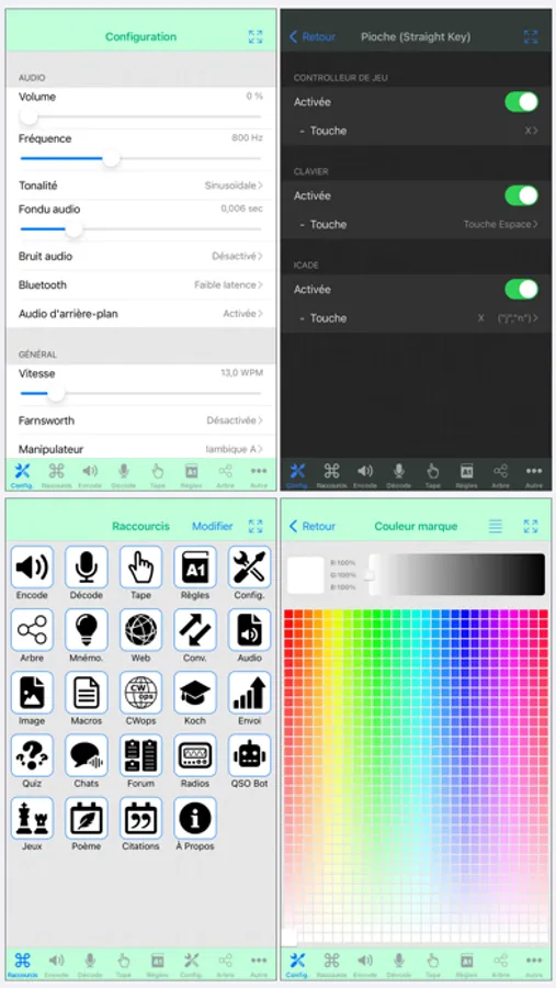 The whole application is highly configurable (frequency, WPM, tone type, color, Morse code, variables ...)