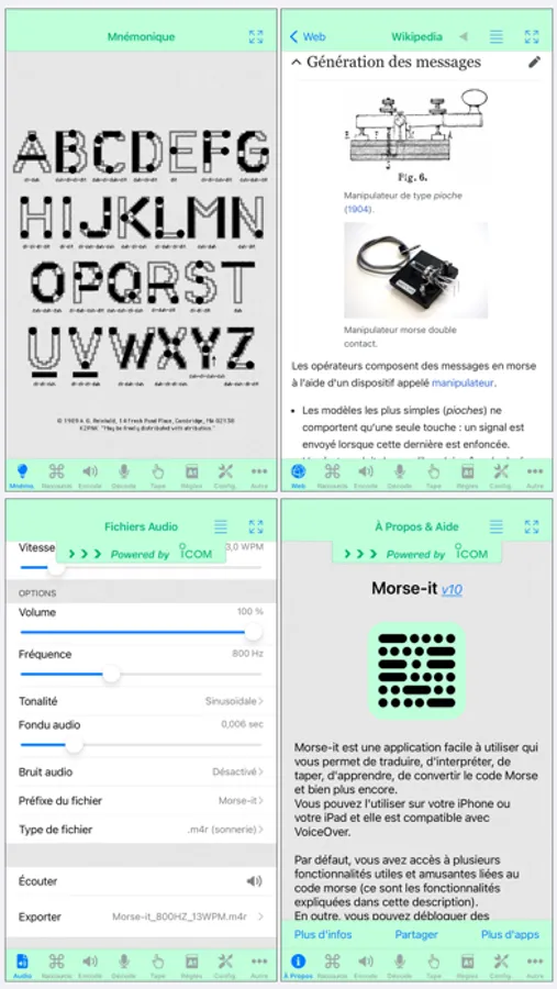 Wikipedia and Visual Mnemonic screens to get information and mnemonics about Morse code.