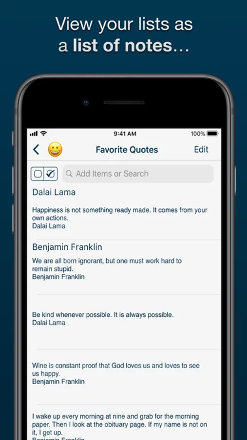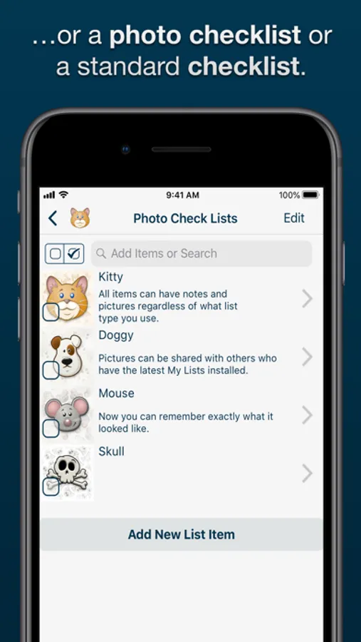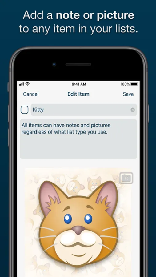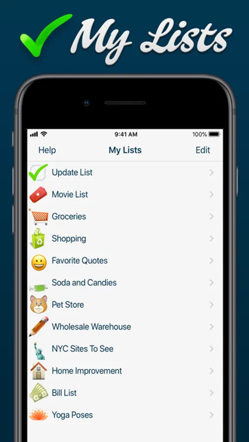 Make lists for anything you need from shopping lists to movies to ideas for your novel, notes for a class to restaurants to try. Add images to your list items with the Photo Checklists option or keep track of notes with the Notes View to help manage larger amounts of data. You can keep track of additional information by adding images to the details view of an item in ANY list type. My Lists contains many great tools which allow you to share, sort, and reorder your lists and items the way that you need in order to effectively manage your daily life.