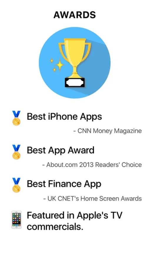 - UK CNET's Home Screen Awards: Best Finance App "..this app isn't one of the sexier uses for iPhone. It's mightily useful, however, for anyone looking to track expenses or plan a monthly budget. The interface is clean and quick to use, with good visual representations of your spending by category..."