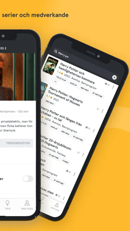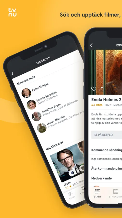 För varje titel visar vi var den kan streamas, eller när den kan ses. Från titlar på streaming kan du använda direktlänkar och se programmet i mobilen eller t.ex. på din TV med Chromecast eller Airplay.