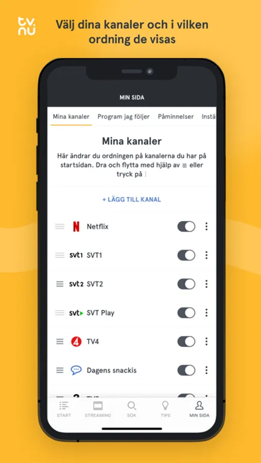 På startsidan får du direkt koll på vad som går på TV och vad som är nytt på streaming. Du anpassar din tablå enkelt inne på Min sida. Där kan du lägga till och ta bort kanaler eller byta ordningen de visas i. Vi har alla de populäraste streamingkanalerna så som t ex Netflix, SVT Play, Viaplay, Viafree, HBO Nordic, Dplay och Itunes och fler än 200 TV-kanaler att välja bland.