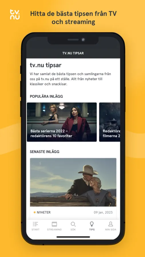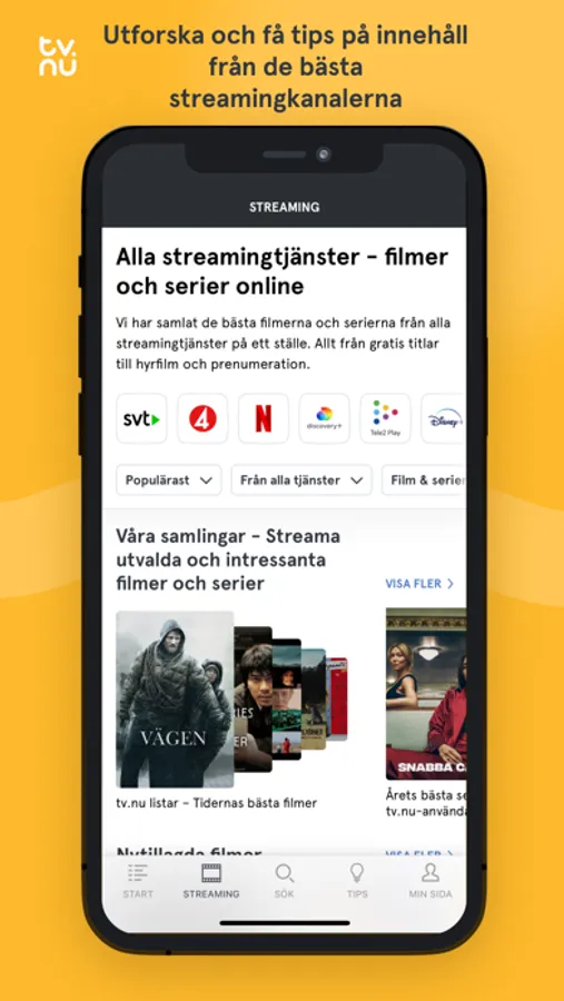 Under Streaming kan du utforska innehållet hos streamingkanalerna, hitta inspiration med samlingar och tips från tv.nu:s redaktörer. Du kan filtrera på olika genrer och se vad som är populärast och högst betygsatt på dina streamingkanaler.