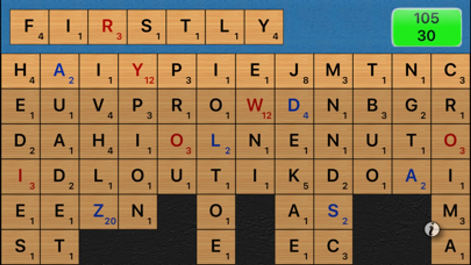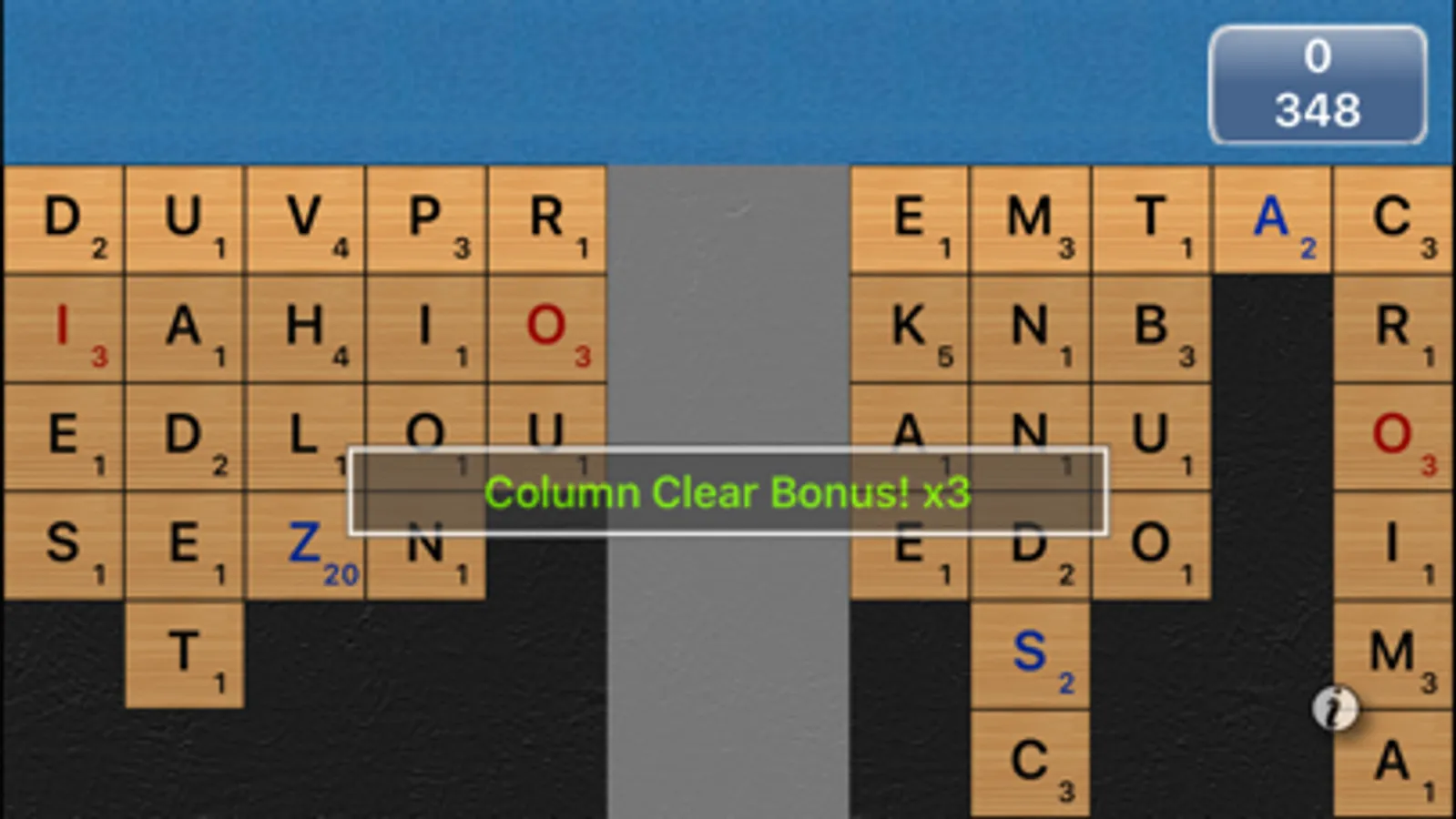 Wordtouch is a fun and challenging word game in which words are formed from a random selection of letters. Try to get the most points by creating high-value words, but remember, only the letters in the top row can be used! Playing a tile will move a column up, requiring you to think horizontally and vertically. Special tiles are worth even more, and bonus points are awarded for clearing columns or the entire board.