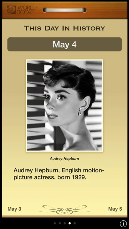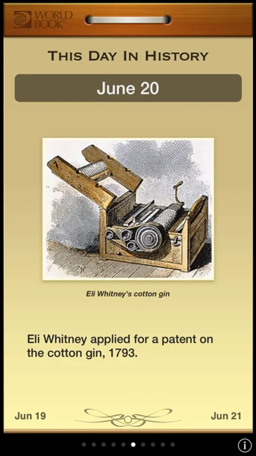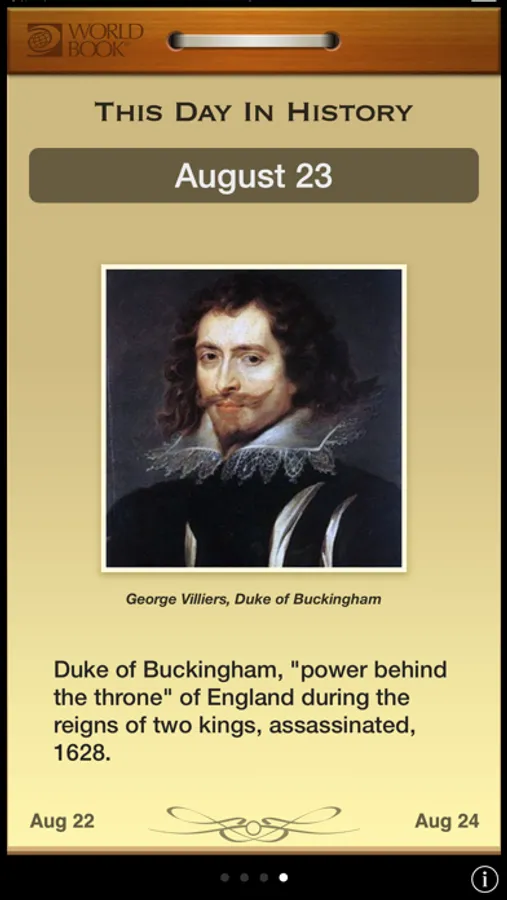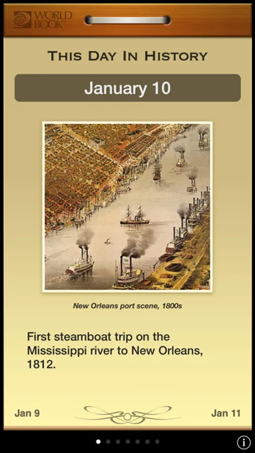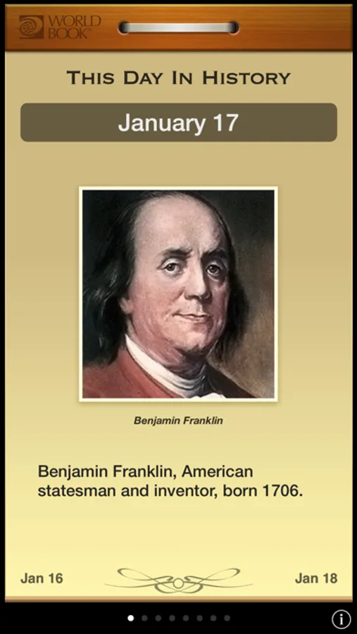 World Book® Encyclopedia and Software MacKiev present This Day in History, an interactive calendar which displays significant historical events that took place on the current day or any selected day, along with a picture. Navigate to any another date or skip forward and back a day at a time. Find out what famous people and events share your birthday. The journey begins here, each and every day.