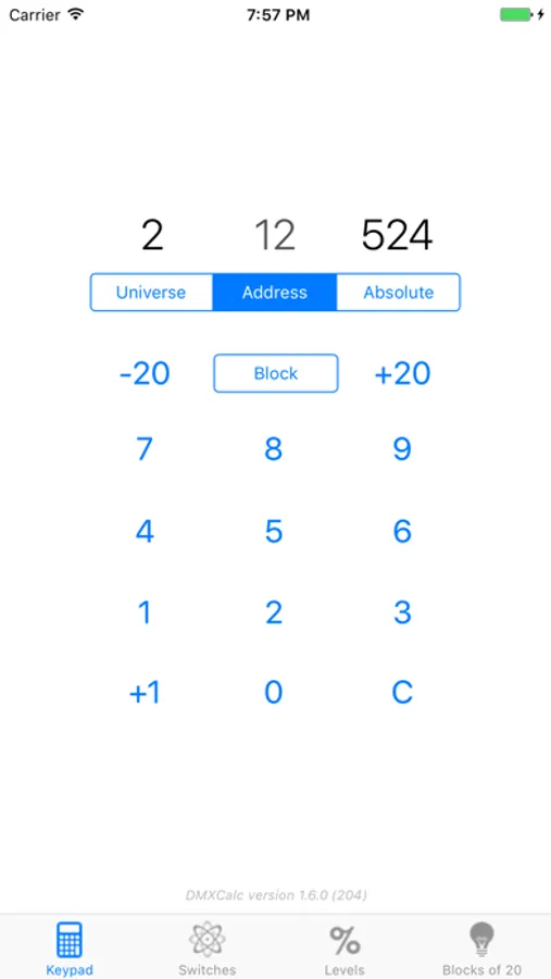 You can enter a DMX universe number and a device address to have DMXCalc calculate the absolute address. Or enter an absolute address to see the universe and device address.