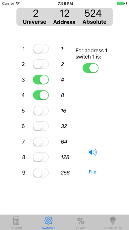 Some DMX equipment utilizes dip switches to configure the address. The dip switch page has switches which show the settings for the current address value, or you can set the switches to match those on a light and discover what its address is. The sound button "plays" dipswitch settings so you can set switches without looking at the display.