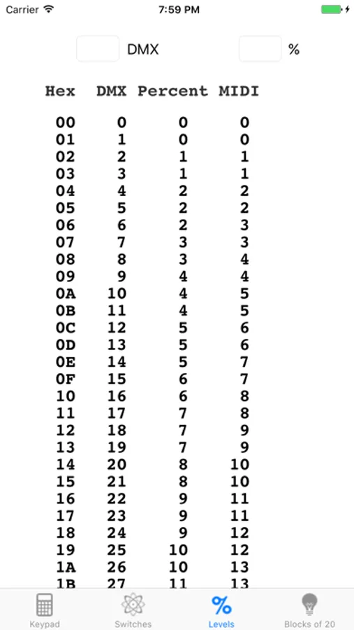 Entertainment lighting equipment uses a control system called DMX512. DMXCalc is a simple and elegant calculator which does address arithmetic for DMX equipment.