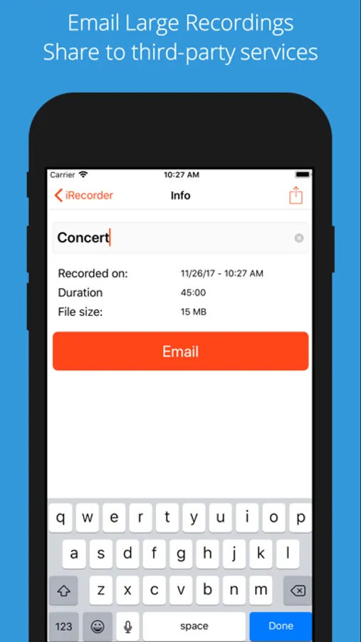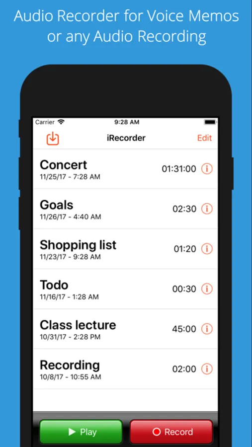 iRecorder is designed to be quick and easy use, and simple to understand. Great for on-the-go capture of your thoughts, ideas, notes-to-self, lectures, concerts, music, you name it! Record for hours, or just seconds.