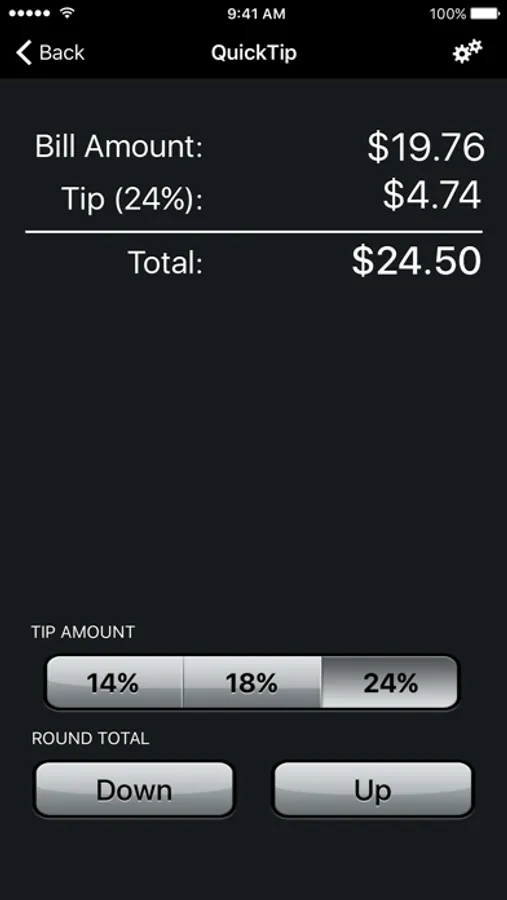 QuickTip provides a fast and convenient way to calculate the gratuity for any bill. Using large text and simple controls, QuickTip is an easy and fun way to figure out tips. An intuitive slider allows you to quickly adjust the tip percentage while seeing the tip and total amounts update in real-time. If you prefer to use buttons, you can set your most frequent tip percentages in QuickTip's settings for easy access. Once you have settled on the tip amount, you can easily round the total bill or the tip amount up or down with the tap of a button. With QuickTip, calculating any tip is only a touch away.