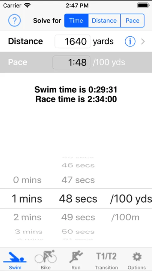 •Solves for time, distance, or pace in swimming, running, or cycling.