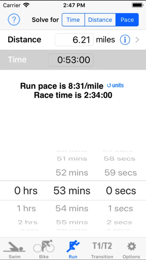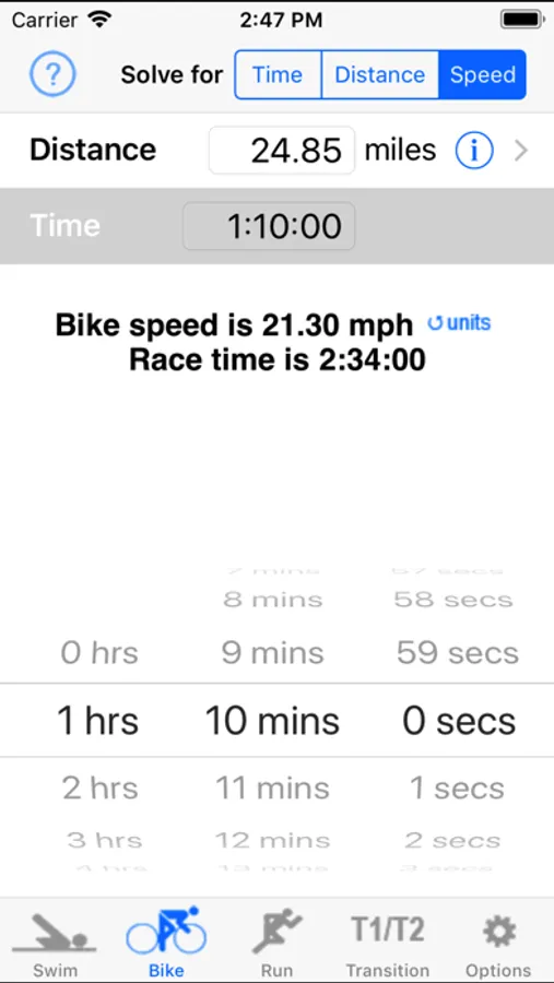 Simply enter your various times, distances or paces for each sport, and TriCalc will calculate the total time for a race. Or use it to individually calculate a single sport race or workout.