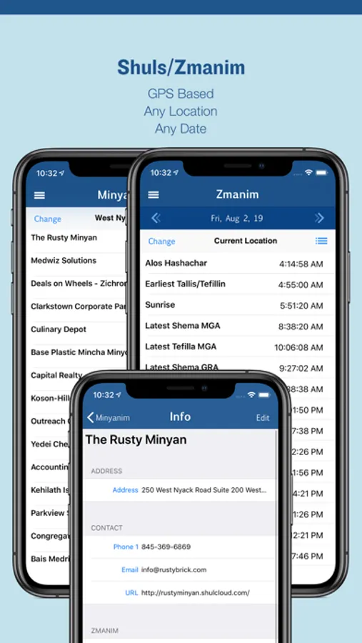* Minyanim finds the closest synagogues to you, shows you their address, phone number, times of service and click for directions on the map.